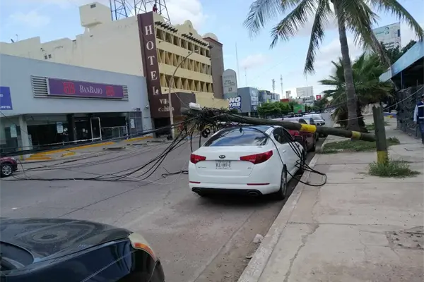 Uno de los postes cayó sobre un vehículo de la marca Kia, color blanco, modelo reciente, causando importantes daños materiales en la unidad, donde por fortuna estaba estacionado y el conductor no se encontraba adentro.