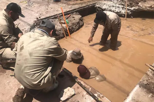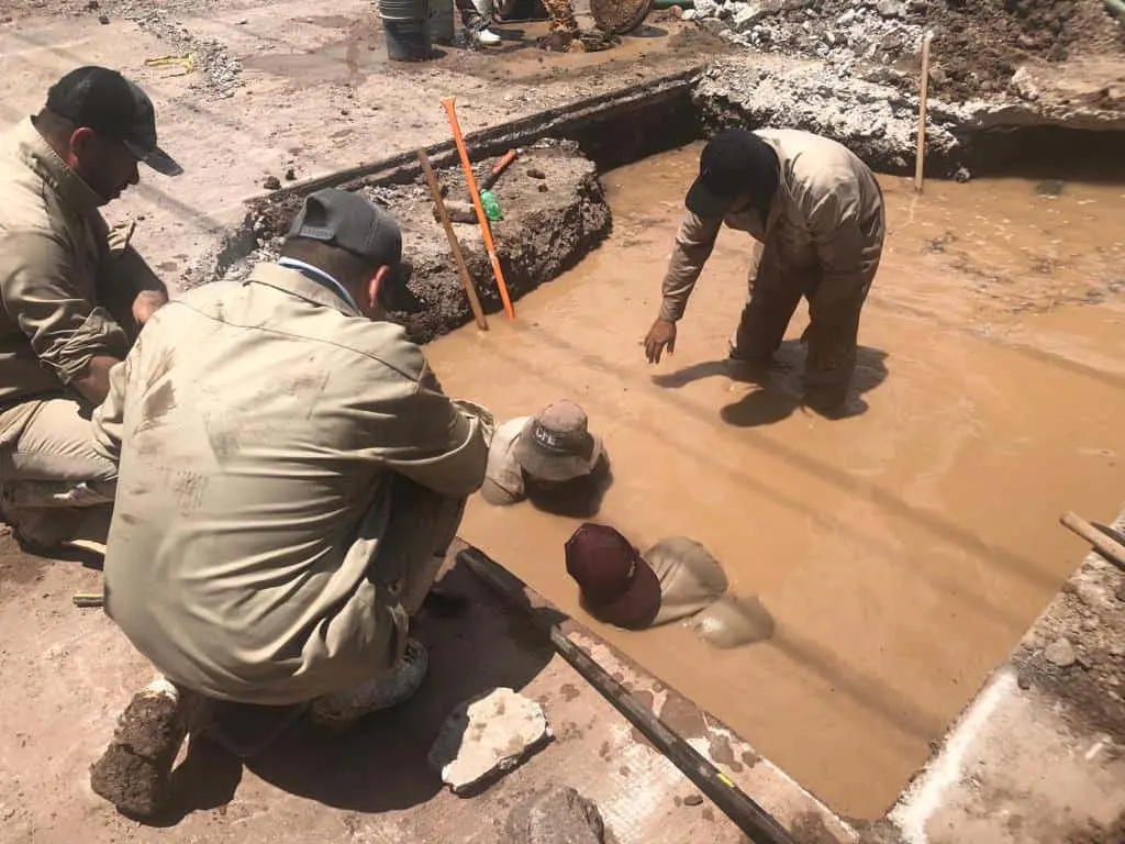 Bajo el agua trabaja personal de JAPAMA para reparar fuga en fraccionamiento San Rafael