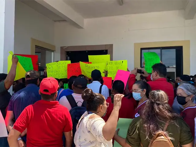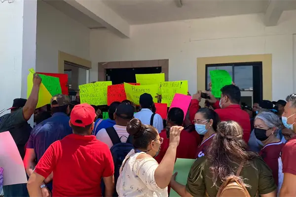 Con pancartas de «alto al acoso laboral», «fuera el jefe de parques y jardines» y «Químico, tus funcionarios están fallando», trabajadores del área de Parques y jardines de la Dirección de Servicios Públicos, se manifestaron en el Ayuntamiento de Mazatlán para pedir el cambio o destitución de su puesto.