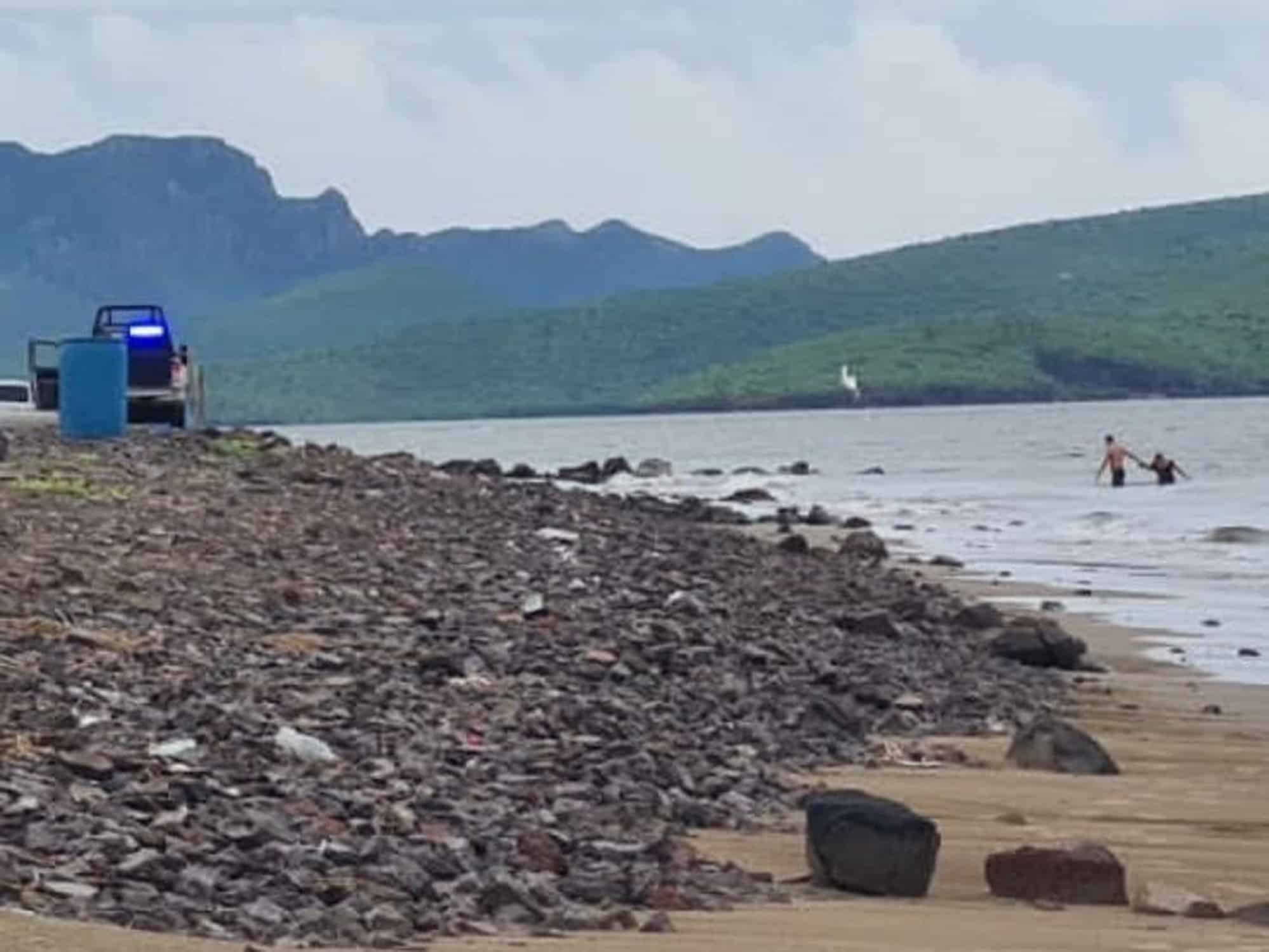 Elementos preventivos de la Secretaría de Seguridad y Protección Ciudadana de Ahome asignados a la Policía Turística, auxiliaron a una mujer que se ahogaba en las aguas de la playa de El Maviri; al llegar, su esposo ya la rescataba.