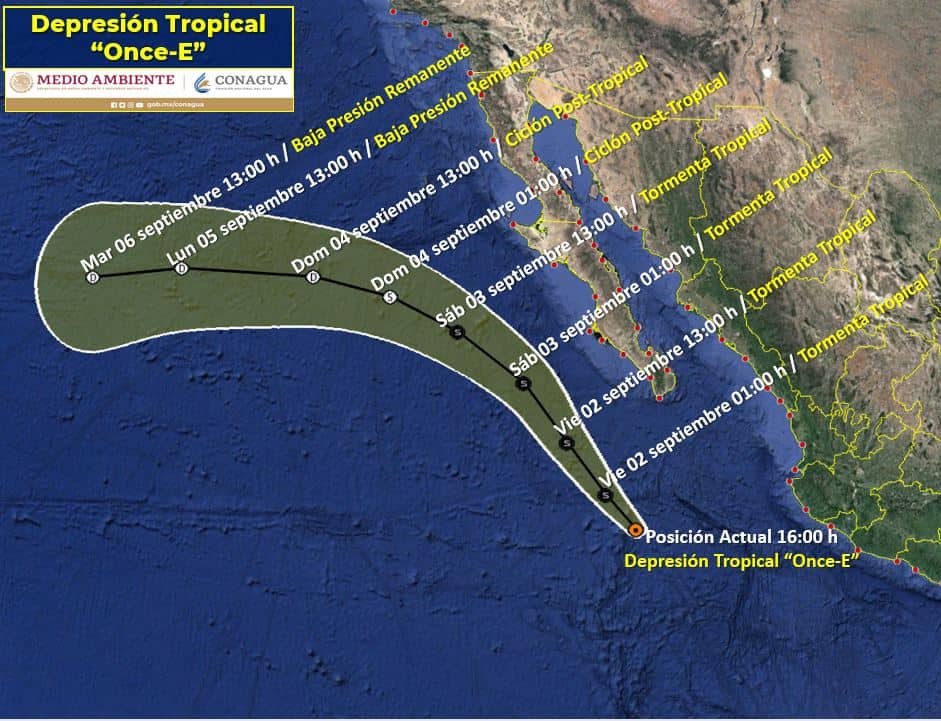 Se ha formado la Depresión Tropical «Once-E» en el Océano Pacífico al sur de las costas de Baja California Sur. Las bandas nubosas del sistema reforzarán el potencial de lluvias fuertes a intensas, además de rachas fuertes de viento en el noroeste y occidente del país.