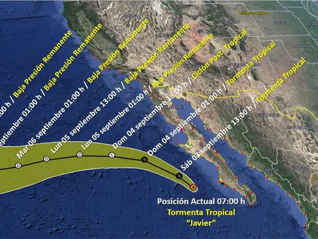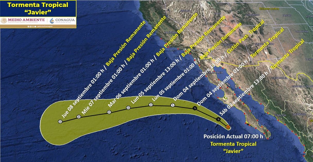 La Tormenta Tropical «Javier» se desplaza frente a la costa occidental de Baja California Sur y ocasiona lluvias fuertes a puntuales muy fuertes en Baja California, Baja California Sur, Sonora, Sinaloa, Chihuahua y Durango., las cuales podrían generar incremento en los niveles de ríos y arroyos, deslaves e inundaciones en los estados mencionados.