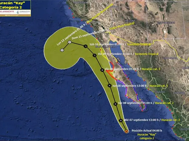 Se intensifica el huracán «Kay» a categoría 2 en escala de Saffir-Simpson se localiza al suroeste de Baja California Sur y al oeste de las costas de Jalisco, con desplazamiento hacia el nor-noroeste y con trayectoria pronóstico paralela a la costa occidental de la Península de Baja California.