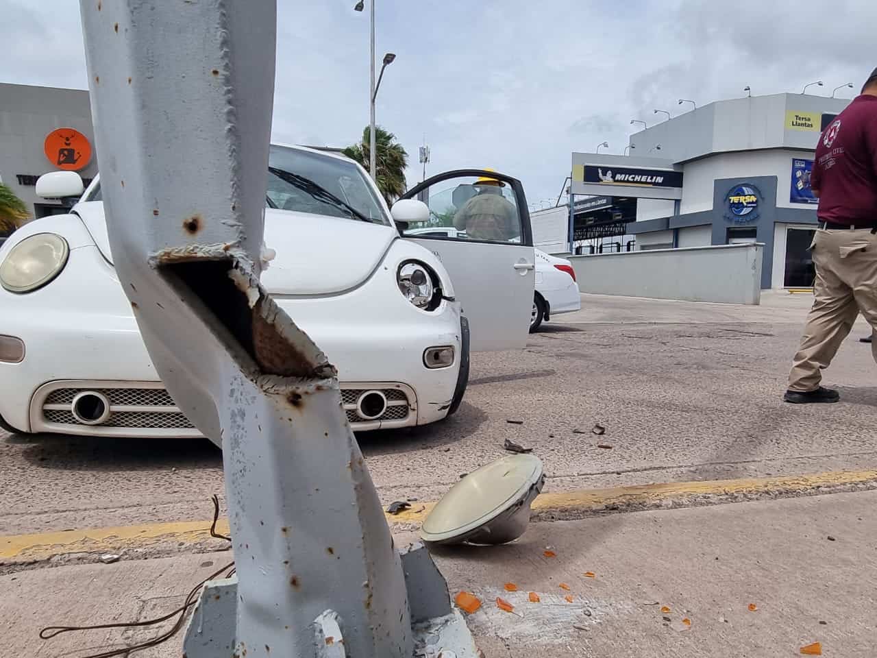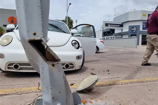 Una joven estuvo apunto de derribar una luminaria del camellón Central del bulevar Antonio Rosales, al norte de Los Mochis, tras perder el control y chocar mientras circulaba presuntamente a exceso de velocidad; una de las versiones es que conducía distraída en el teléfono celular otra que se le cayó encima su café.