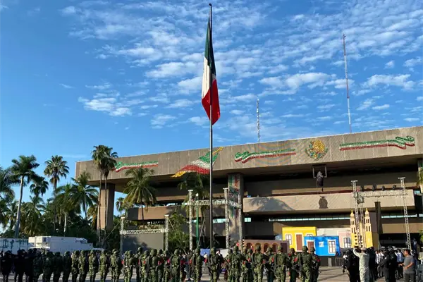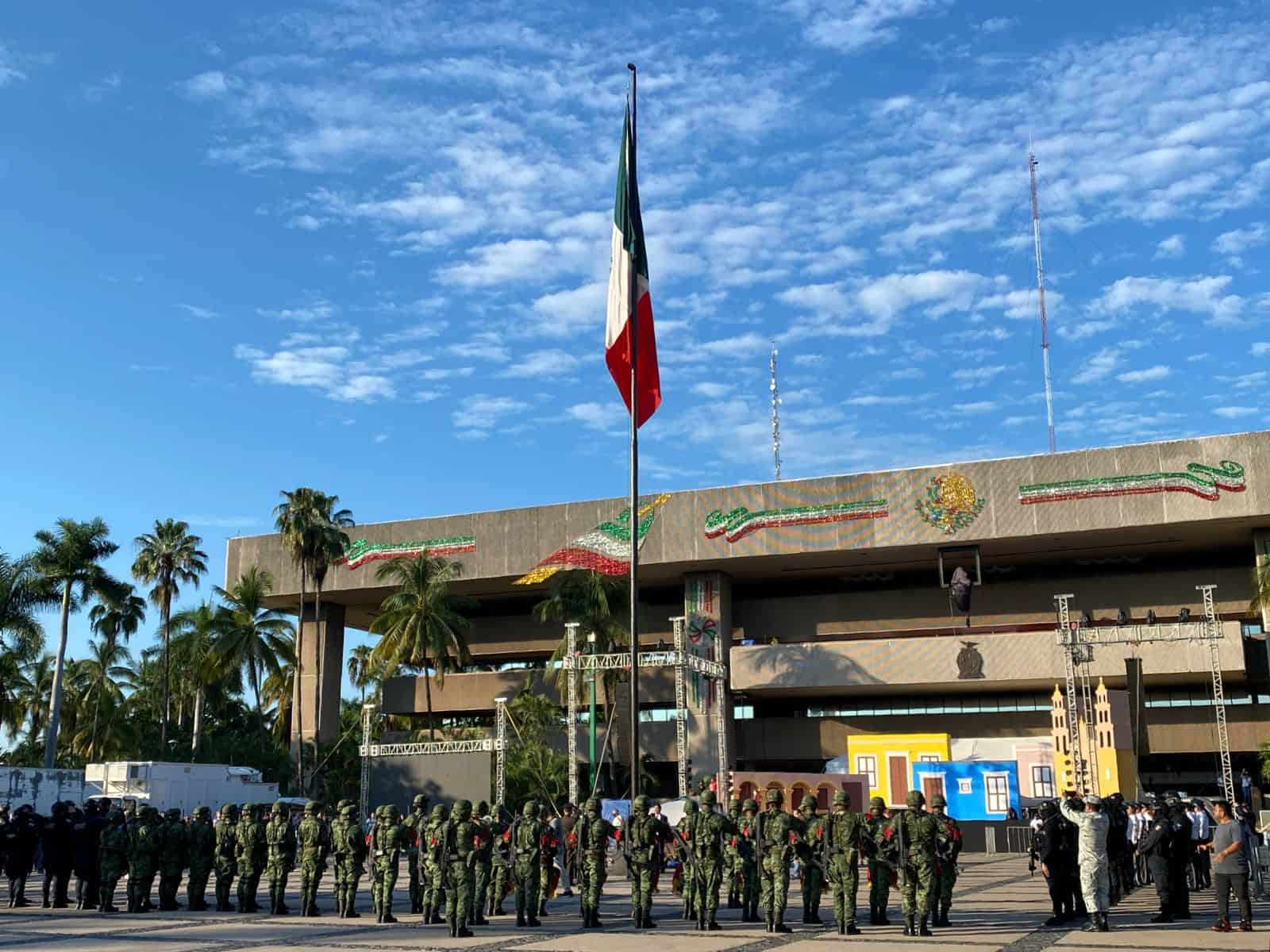 Elementos de seguridad e integrantes del gabinete del Gobernador, Rubén Rocha Moya, rindieron honores e izaron la bandera en conmemoración del inicio de la Independencia de México.