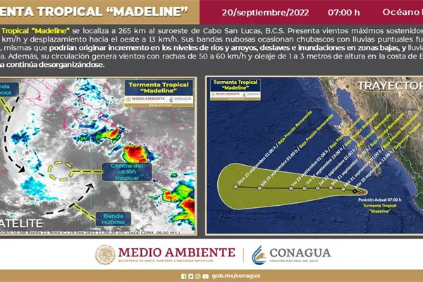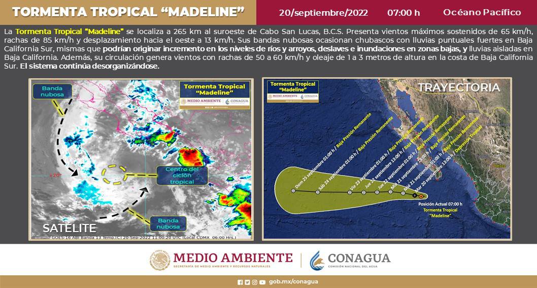 El Servicio Meteorológico Nacional (SMN) informó que la Tormenta Tropical «Madeline» se localizará al suroeste de la Península de Baja California y comenzará a disiparse al final de este día.