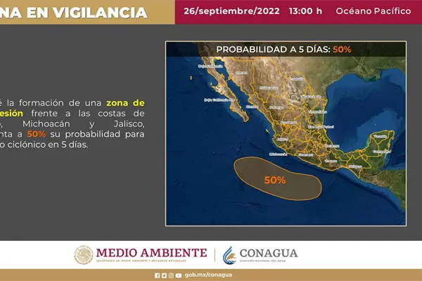 El Servicio Meteorológico Nacional (SMN) informó que ya se encuentra vigilando la zona de baja presión que se encuentra frente a las costas de Guerrero y Michoacán, con un potencial de desarrollo ciclónico del 50 por ciento en los próximos 5 días.