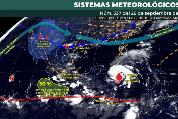 La aproximación del huracán «Ian» originará el flujo de aire húmedo del Mar Caribe hacia costas de la Península de Yucatán, generando lluvias puntuales muy fuertes en Quintana Roo y Yucatán, así como lluvias puntuales fuertes en Campeche; rachas de viento de 60 a 70 km/h y oleaje de 2 a 3 metros de altura.