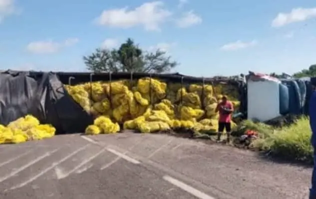Las caja del tráiler estaba cargada con arpillas, las cuales algunas de ellas quedaron regadas en el pavimento.