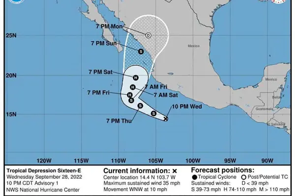 La depresión tropical 16E está tiene 90 por ciento de probabilidad de desarrollo ciclónico.