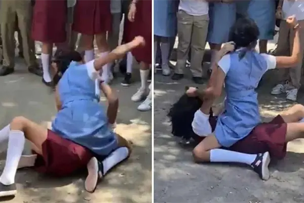 En los videos de 22 y 30 segundos, se observa como la alumna de segundo grado (vestido azul) está montada en la otra menor de tercero (vestido tinto), a quien sostiene del cabello con la mano izquierda, mientras que con la mano derecha la golpea con el puño.