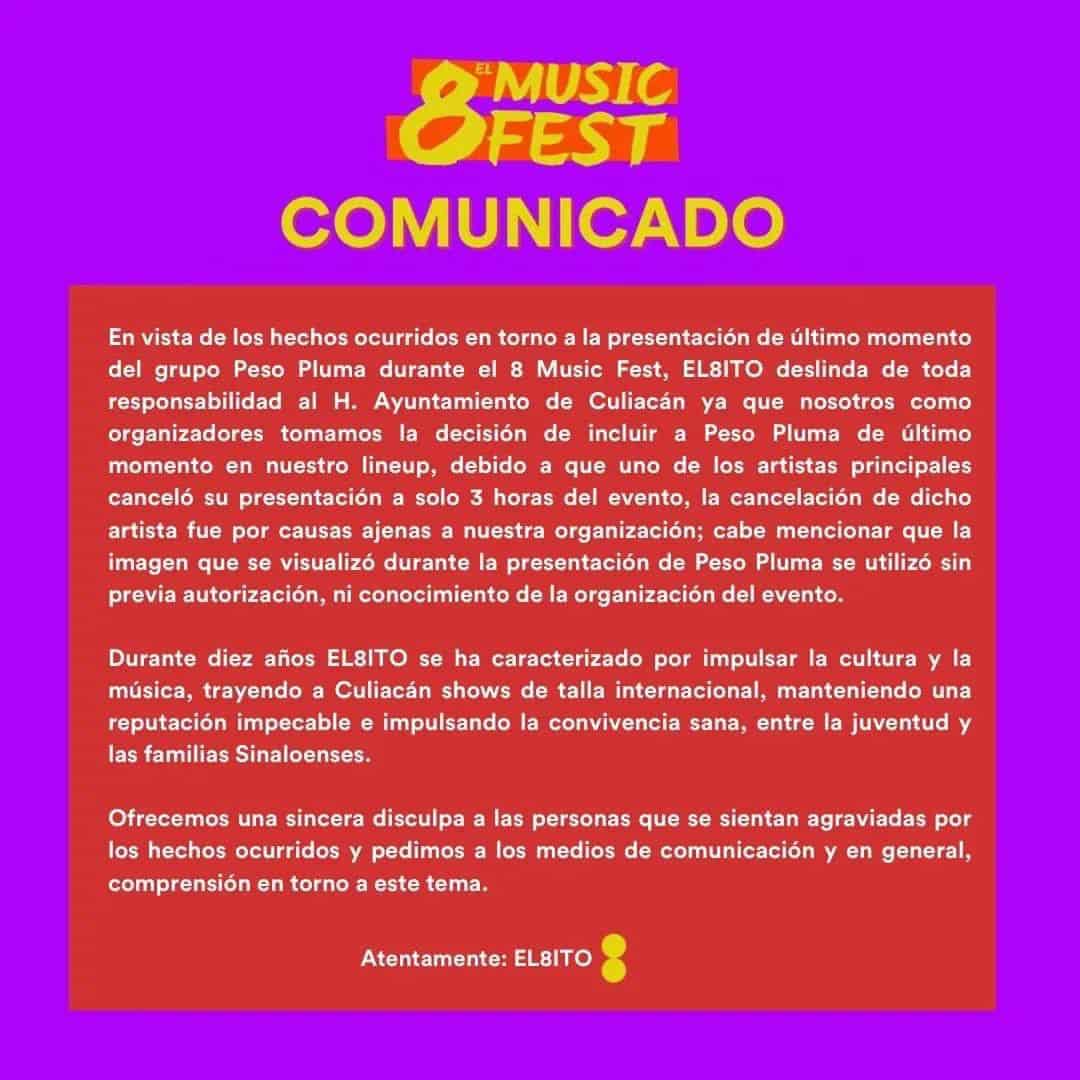 En el comunicado los organizadores indicaron que ellos desconocían que el artista “Peso Pluma” proyectaría una imagen alusiva a JGL, por lo que pidieron una disculpa pública a las personas que se sintieron agraviadas.