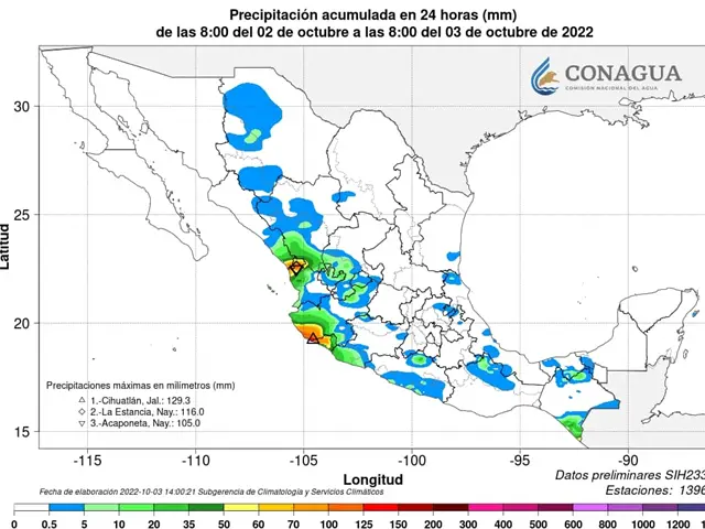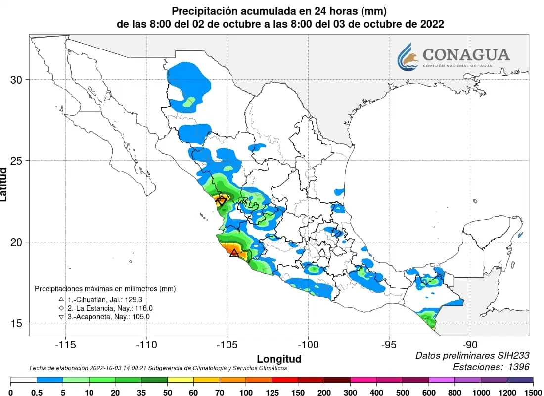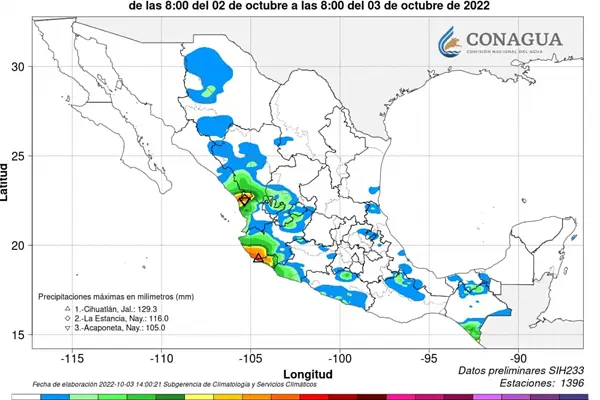 Un canal de baja presión sobre el noroeste, norte y occidente del país, en interacción con la humedad remanente de «Orlene», la corriente en chorro subtropical e inestabilidad en niveles a ltos de la atmósfera, originarán lluvias puntuales muy fuertes sobre Sinaloa, Colima, Nayarit, Aguascalientes, Guanajuato, Jalisco y Michoacán.