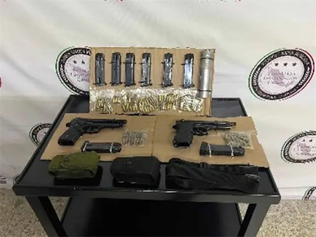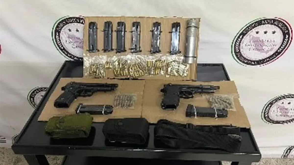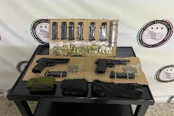 Se informó que durante la minuciosa revisión al vehículo, se localizaron dos armas de fuego tipo escuadra de color negro, ocho cargadores, un total de 105 cartuchos útiles para arma corta calibre nueve milímetros, aditamentos tácticos y otros objetos de delito.
