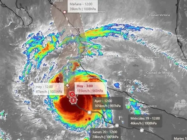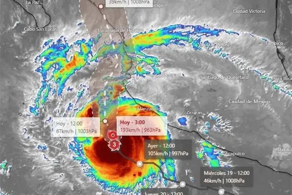 Con corrientes, Jalisco con vientos máximos sostenidos de 195 kilómetros por hora, rachas de 240 kilómetros por hora y desplazamiento hacia el noroeste a 11 kilómetros por hora.