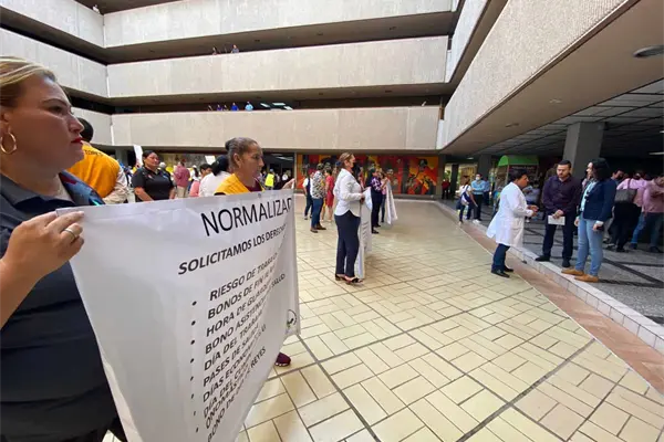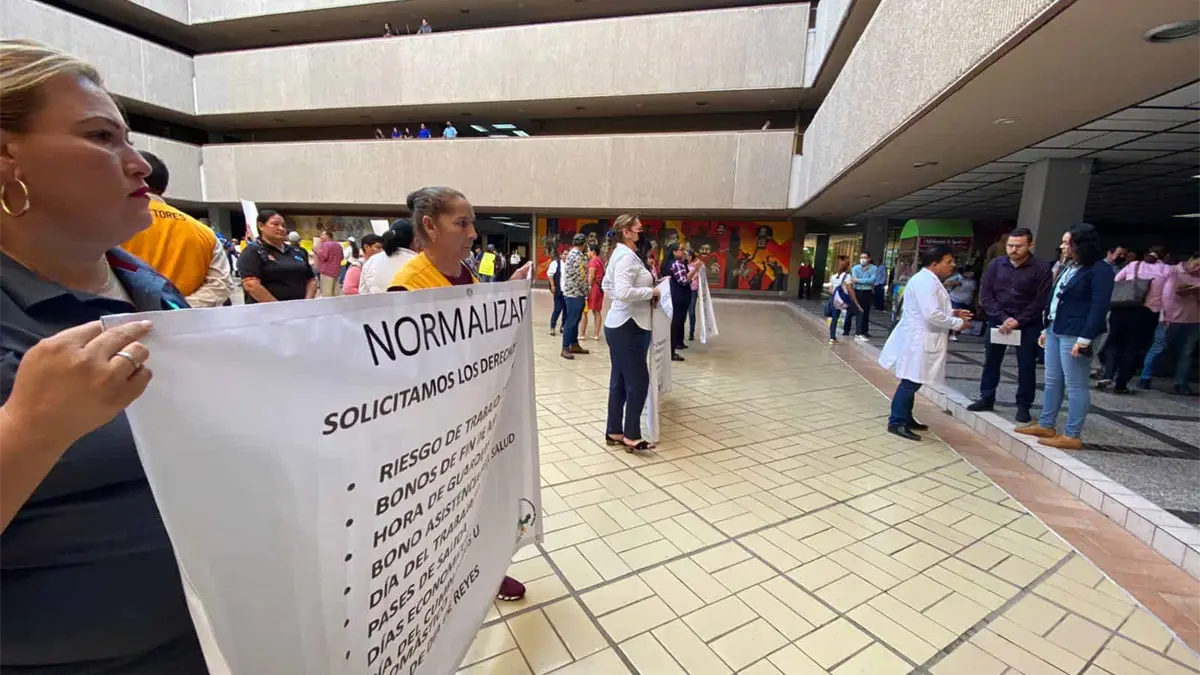 Trabajadores y personal del sector salud se manifestaron este lunes en las inmediaciones de palacio de gobierno, con la exigencia qué se entreguen las 230 bases que faltan, así como respetarles los años de antigüedad que acumularon antes de obtener una base de IMSS bienestar.