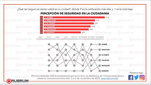 La información publicada en el sitio www.rubrum.com.info, indica que la encuesta se realizó del 2 al 5 de noviembre de este año 2022 en los principales municipios del Estado de Sinaloa, colocando a Ahome y su alcalde Gerardo Vargas Landeros, en el primer lugar.