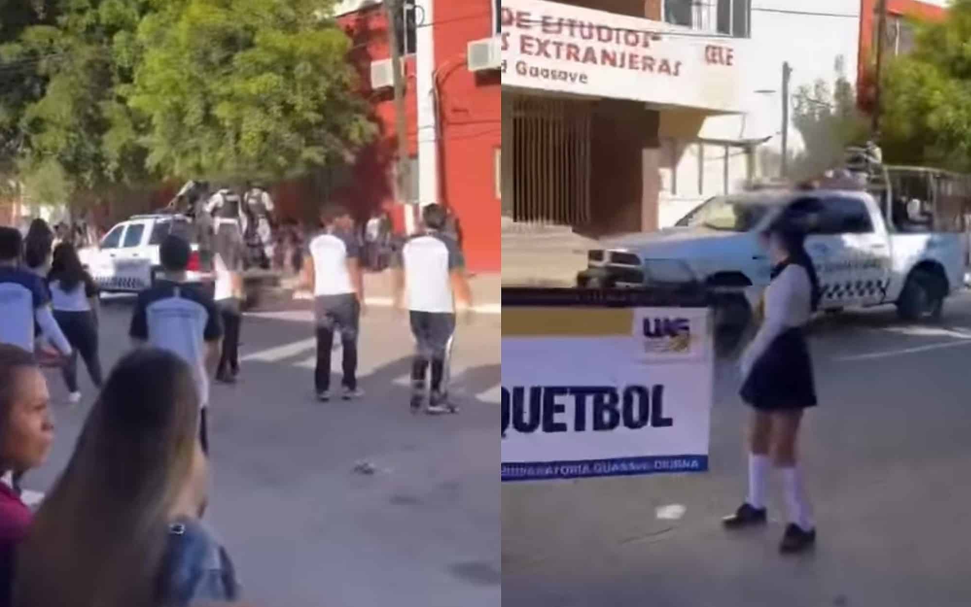 El hecho se registró esta mañana, sobre la calle Corregidora, entre Zaragoza y Carrasco en el centro de la ciudad de Guasave, el medio del desfile que pasaba por el sector comercial, y a donde llegaron dos unidades de la Guardia Nacional e irrumpieron el acto cívico, deteniendo por un par de minutos el contingente.