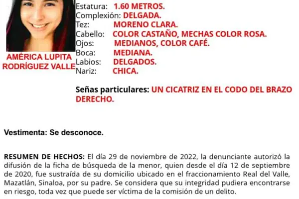 La Fiscalía del Estado de Sinaloa emitió una ficha de búsqueda para dar con el paradero de las pequeñas Ximena Sarahí Rodríguez Valle y América Lupita Rodríguez Valle, de 2 y 14 años de edad, respectivamente.