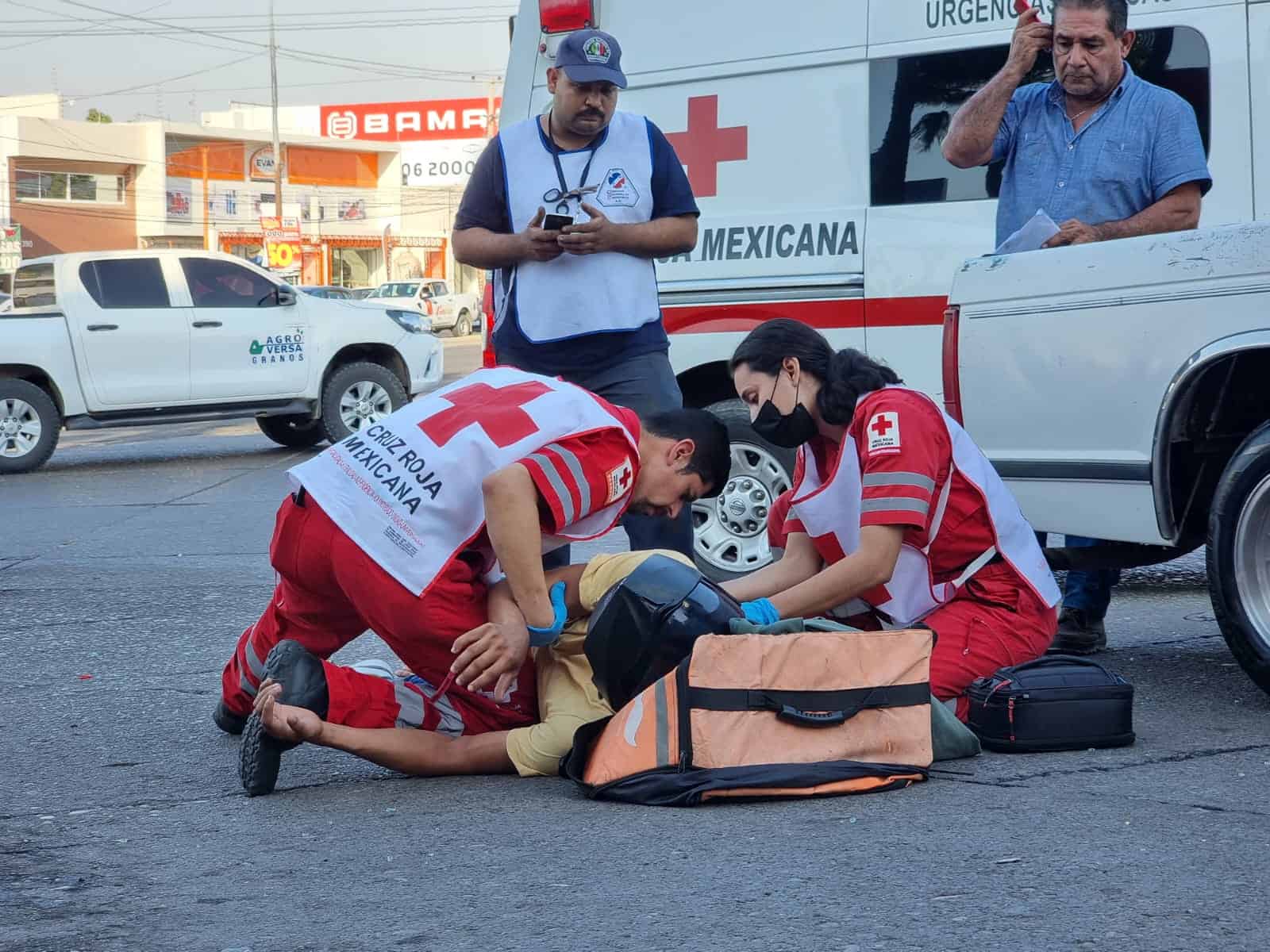Un joven motociclista repartidor de conocida aplicación resultó con probable fractura de espalda al chocar contra una camioneta en el cruce de los bulevares Emiliano Zapata y Maquio Clouthier, en la colonia El Vallado.