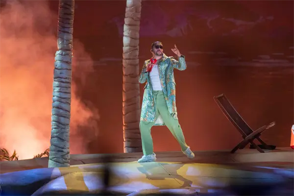 Con un escenario que simulaba ser una playa con palmeras, el cantante boricua inició su espectáculo del viernes a las 22.00 horas GMT (03.00 GMT) con la canción «Moscow Mule», coreada por un recinto con capacidad para alrededor de 87 mil personas.