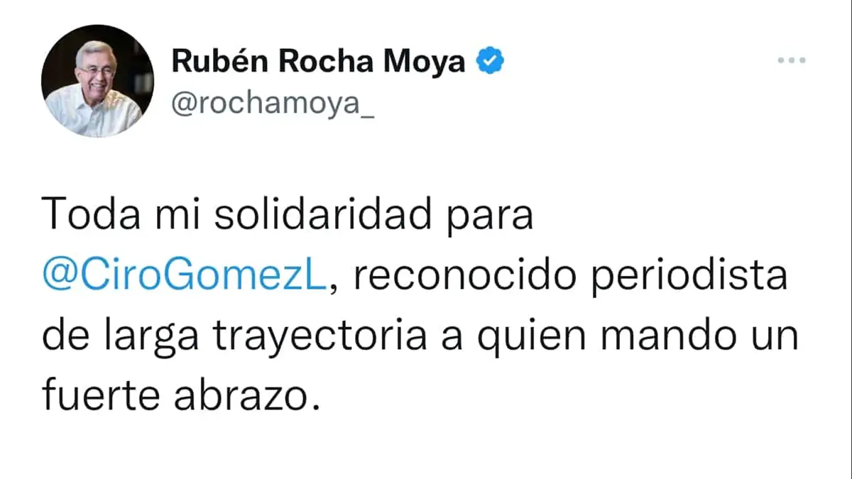 «Toda mi solidaridad para @CiroGomezL, reconocido periodista de larga trayectoria a quien mando un fuerte abrazo», compartió el gobernador.