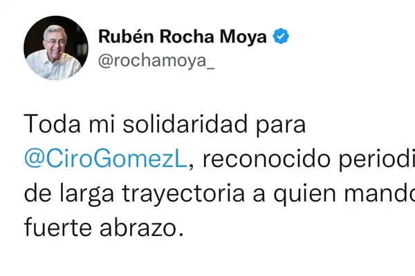 Tras el atentado con arma de fuego que tuvo el periodista, Ciro Gómez Leyva, el Gobernador de Sinaloa, Rubén Rocha Moya externó su solidaridad.