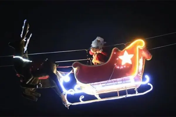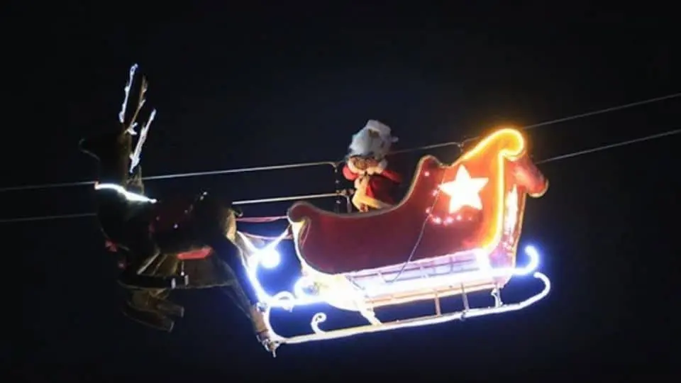 Presuntamente el operador del trineo pisó el freno cuando presentaban la atracción «El Vuelo de Santa». La protección con arnés que llevaba puesta evitó que se precipitara al vacío. Solo fue el susto, comentaron los espectadores.