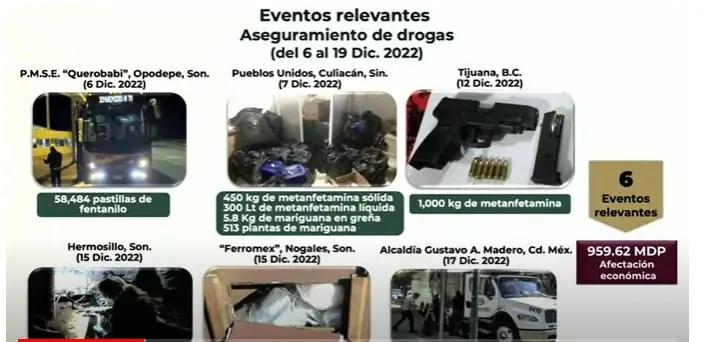 Finalmente, Crescencio Sandoval también informó de importantes aseguramientos en Sonora, Tijuana, Baja California y en la Ciudad de México, en los cuales se logró una afectación económica hacia quienes realizan actividades ilícitas de 959 millones de pesos.