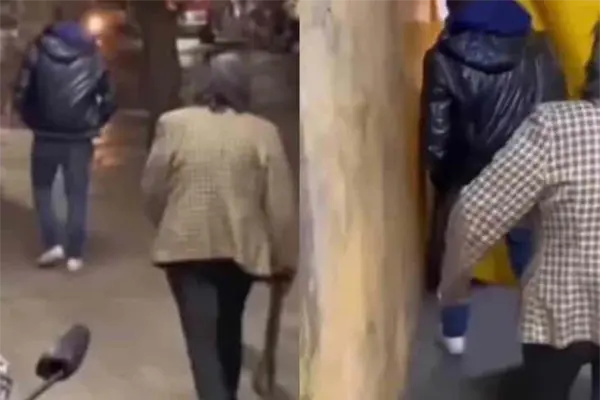 El video compartido en redes sociales muestra el momento en que una mujer sostiene un cinturón entre manos, mientras camina detrás de un hombre que camina a gran velocidad.