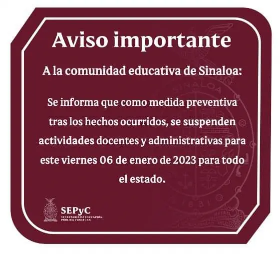 «A la comunidad educativa de Sinaloa: Se informa que como medida preventiva tras los hechos ocurridos, se suspenden actividades docentes y administrativas para este viernes 06 de enero de 2023 para todo el estado», se lee en el comunicado de la SEPyC.
