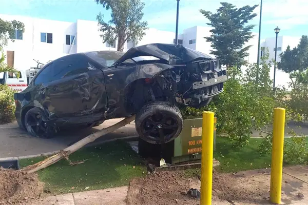 Destrozado del cofre y daños en otras partes de la carrocería quedó un automóvil de la línea BMW, después de que su conductor perdió el control del volante y chocó de frente contra un árbol y una luminaria en el fraccionamiento Portalegre, ubicado en el sector poniente de Culiacán.