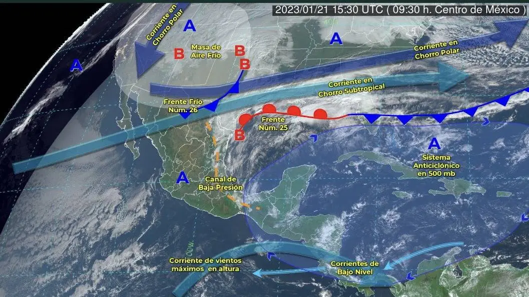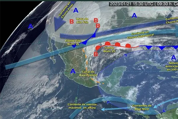 El frente frío número 26 se desplazará sobre el norte y noreste de la República Mexicana y en interacción con las corrientes en chorro polar y subtropical, ocasionarán lluvias aisladas en Coahuila y Nuevo León, rachas fuertes de viento con tolvaneras sobre el noroeste, norte, noreste y occidente del país.