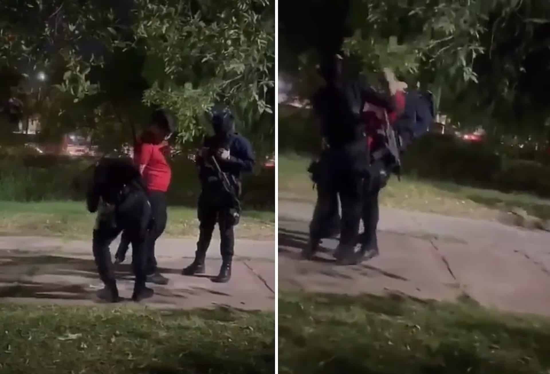 El hecho ocurrió en el Parque Las Riberas y el video termina cuando uno de los elementos se acerca a la persona que estaba grabando la acción e intenta quitarle el teléfono.