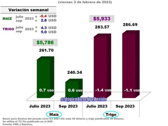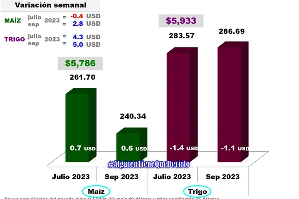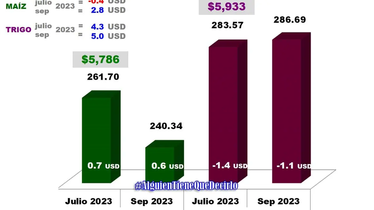 Por otra parte, los futuros de trigo, a julio del 2023, perdieron 1.4 dólares para ubicarse en 283.57 dólares, lo que significa un ingreso estimado al productor de $5 mil 933 por tonelada de trigo panificable, mientras que los futuros de trigo, a septiembre del 2023, bajaron 1.1 dólares para ubicarse en 286.69 dólares.