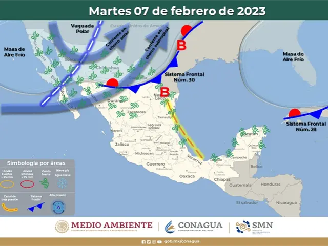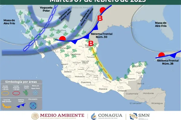 De acuerdo con el pronóstico del tiempo del SMN, el Frente Frío 30 recorrerá el norte del territorio nacional, continuará asociado con una vaguada polar y con las corrientes en chorro polar y subtropical, lo que provocará rachas fuertes de viento con tolvaneras.