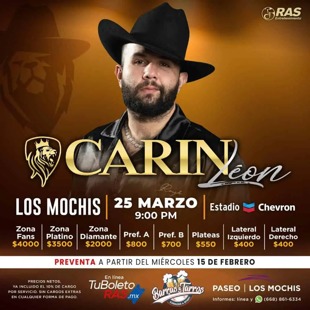 Carin León se presentará en la ciudad de Los Mochis, así lo confirma un comunicado proveniente de RAS Entretenimiento.
