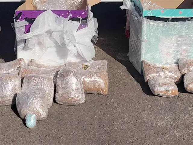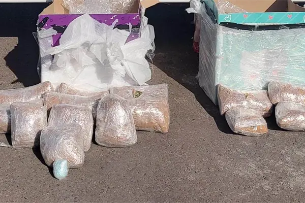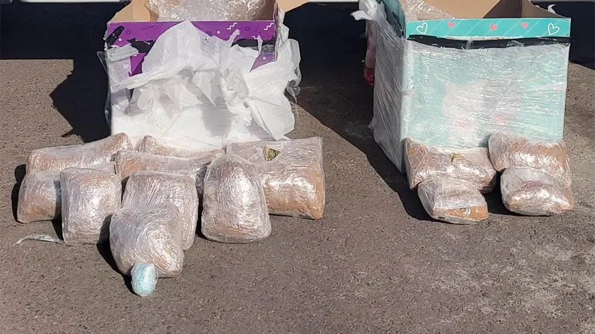 Ambas cajas fueron esculcadas y se descubrió que contenían en el interior 14 envoltorios con hierba seca y verde con las características de la mariguana.