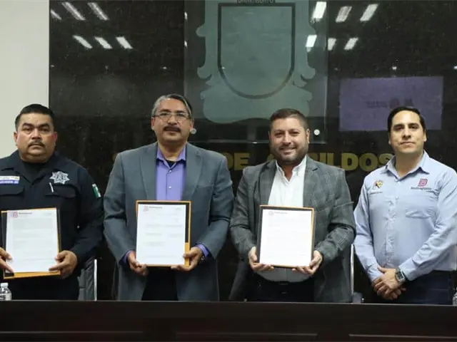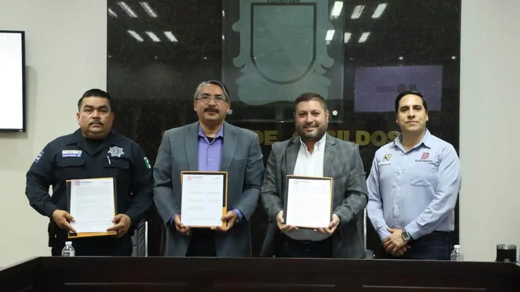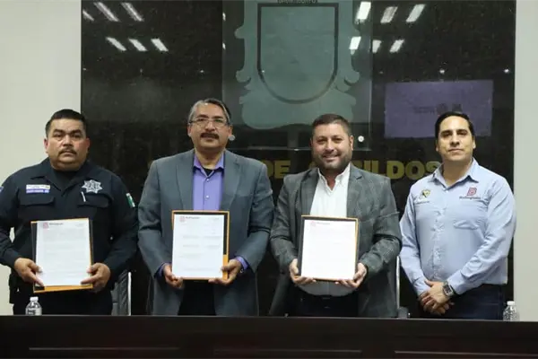 La firma de convenio tuvo lugar en Palacio Municipal, donde estuvo presente el director de Seguridad Pública, Omar García Luna; regidores y funcionarios del gabinete.