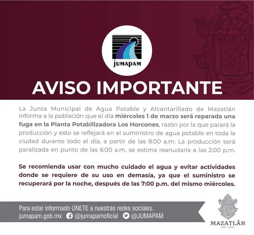«La Junta Municipal de Agua Potable y Alcantarillado de Mazatlán informa a la población que el día miércoles primero de marzo será reparada una fuga en la Planta Potabilizadora Los Horcones, razón por la que parará la producción y esto se reflejará en el suministro de agua potable en toda la ciudad durante todo el día», se informó a través del comunicado.