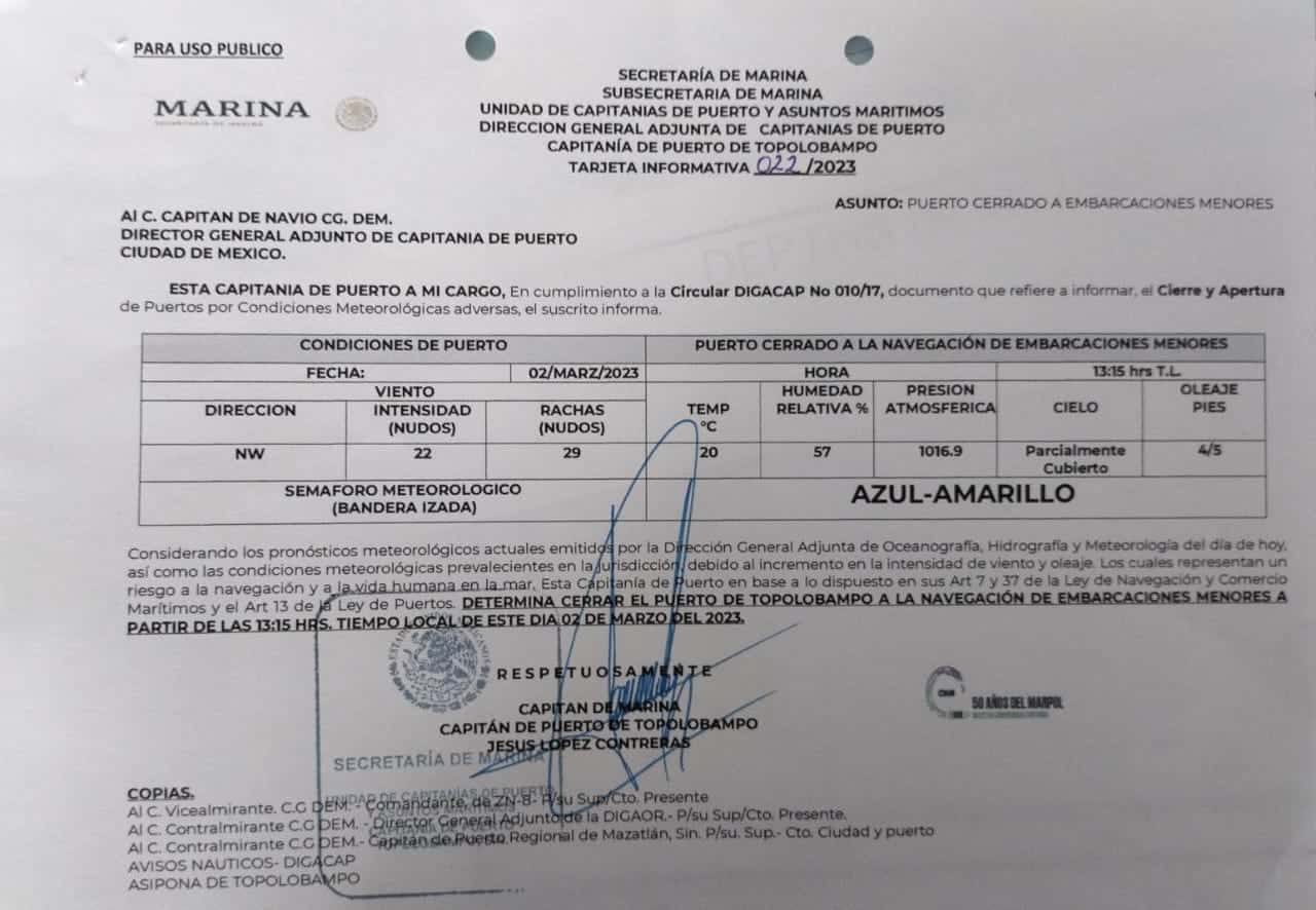 Capitanía del puerto en Topolobampo determinó cerrar a la navegación de embarcaciones menores para la tarde de este jueves 2 de marzo por intensidad del viento de 40 kilómetros por hora y rachas de hasta 53 kilómetros por hora.