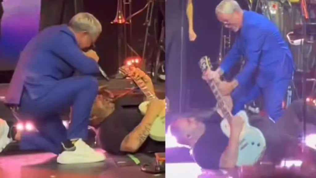 En redes se viralizó el momento en el intérprete de canta en el gran un concierto y el español tiró a su guitarrista por accidente.