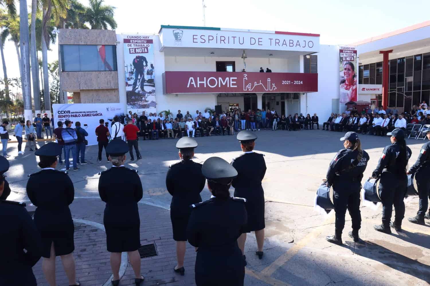Con ceremonia cívica y guardia de honor el municipio de Ahome conmemoraron el natalicio del Benemerito de las Américas.