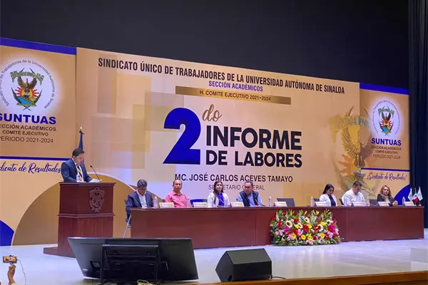 En el marco del segundo Informe de Labores del maestro José Carlos Aceves Tamayo, secretario del Sindicato Único de Trabajadores de la Universidad Autónoma de Sinaloa (SUNTUAS), sección Académicos, el Rector de la Universidad Autónoma de Sinaloa (UAS), Jesús Madueña Molina, enfatizó que los resultados alcanzados en este periodo son visibles y dan fortaleza al quehacer de los docentes de la institución.