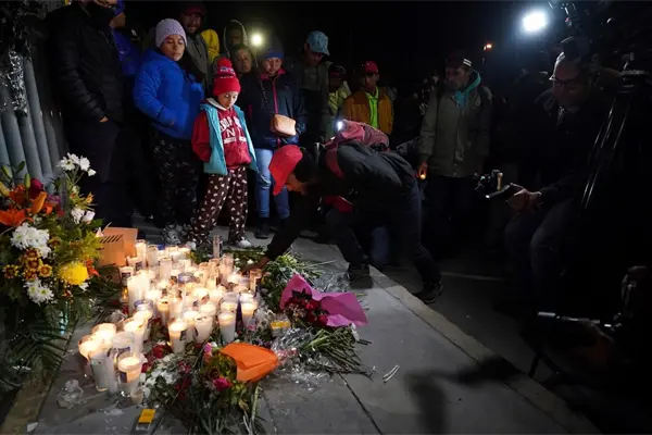 Se puede ver una estructura de cableado de metal colgando del borde, que parece haber cedido; afuera, multitudes ansiosas se reunieron fuera del templo, y las autoridades sacaron a los heridos en camillas.