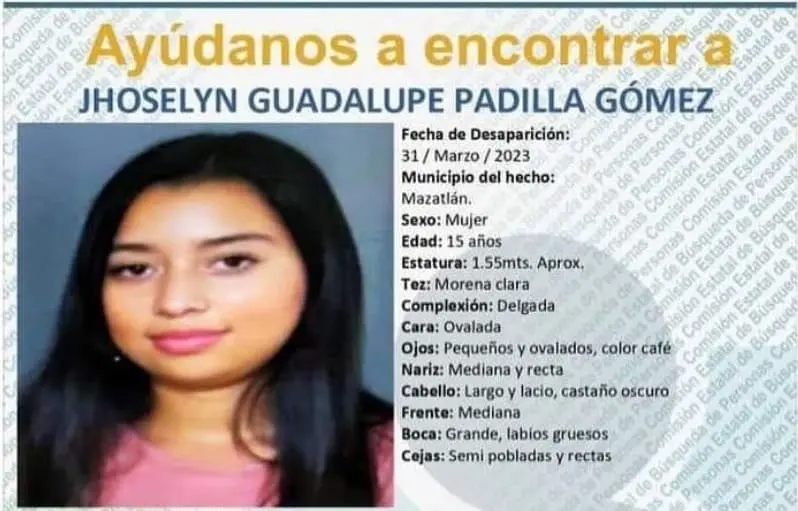 En esta ocasión se trata de Jhoselyn Guadalupe Padilla Gómez, de 15 años de edad, quien salió de su casa el pasado viernes 31 de marzo, 15 minutos antes de las 22:00 horas y ya no volvió, por lo que fue reportada ante autoridades y ante la Comisión Estatal de Búsqueda de Personas Desaparecidas.