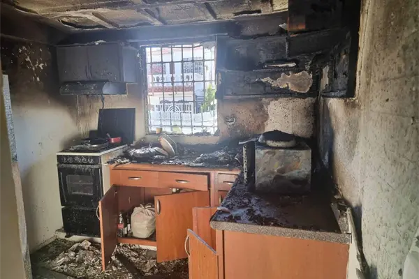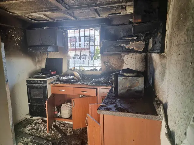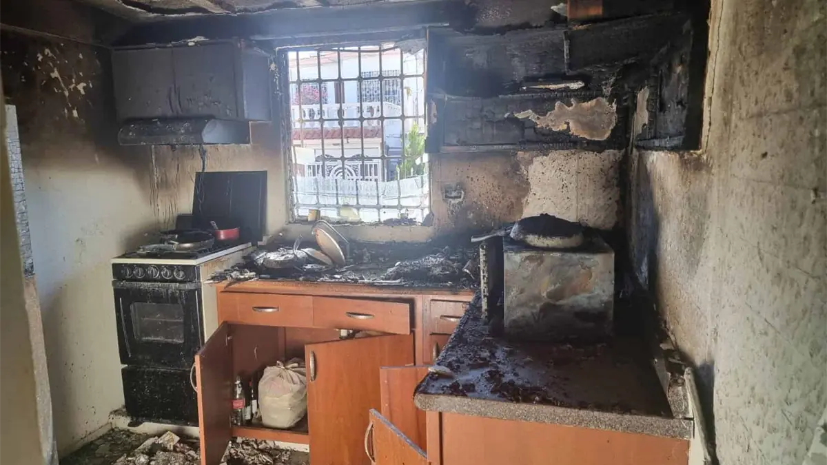 A simple vista se alcanza a ver los daños en la cocina y cómo el fuego consumió el refrigerador, horno de microondas, la estufa, los estantes de madera y parte del techo, ya que el enjarre se desprendió por la temperatura.