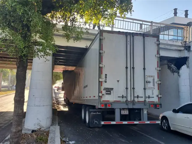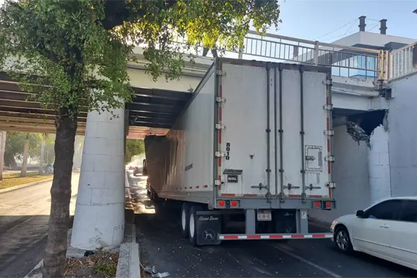 El accidente se dio alrededor de las 6:00 horas, cuando la unidad Kenwood de procedencia de Monterrey circulaba por el Paseo Niños Héroes y al pasar por debajo del puente la caja quedo prensada y al tratar de salir se partió parte de la caja.