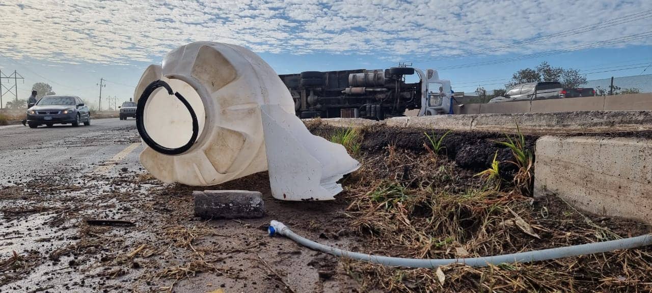 Miles de alevines de camarón que eran transportados en un camión quedaron esparcidos sobre el acotamiento de la carretera Internacional México 15, luego de que la unidad volcó al llegar a la sindicatura de Juan José Ríos, Guasave.