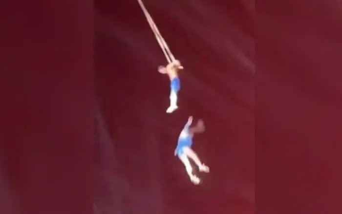 Mientras se balanceaban en el aire, la mujer rodeó con sus brazos la cabeza de su marido y se colgó de él durante un acto de transición. Pero perdió el agarre y se precipitó al duro escenario entre los gritos del público.